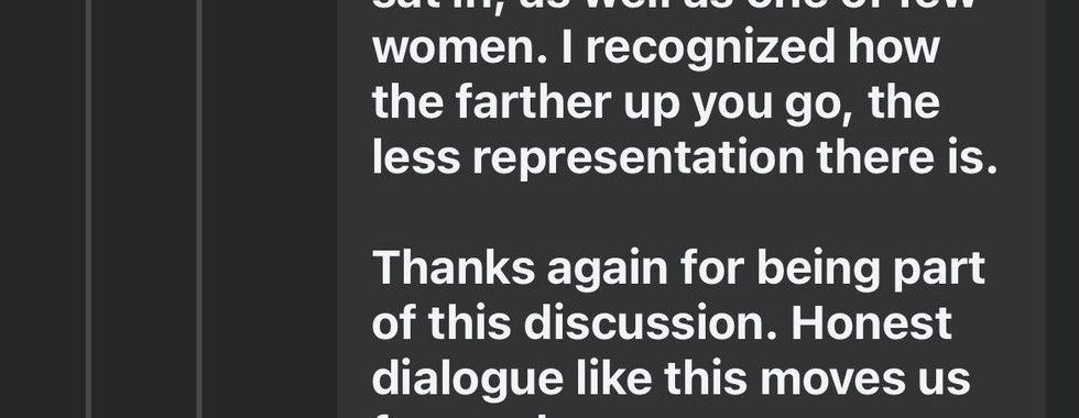 It is at best exhausting, and worst dangerous, being the only, or one of only a few women in the room. It allows us to be ignored or bullied without having any recourse. Our schools where we get into massive debt don't protect us, our jobs after school won't protect us. Yes, there has been huge progress made by you and women like you for which I have great respect. We also need more."