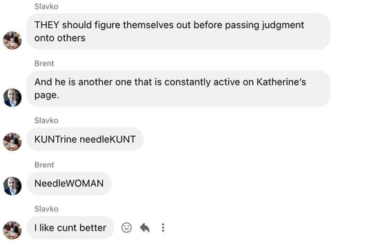 Katherine and I also noticed that he hadn't reported Brent or Slavko's unprofessional behavior to the Calgary Phil, which is what he would have done if he truly did not support gender slandering (i.e. calling Katherine a cunt). The Calgary Phil has a code of conduct policy requiring musicians to act professionally and not to speak ill or make defamatory remarks about other professional musicians. Brent and Slavko clearly would have been reprimanded long ago if Alex had reported them for breaking this policy.