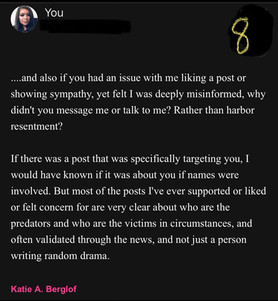 Also, the screenshot messages he forwarded to Katherine of Brent and Slavko degrading her are clearly from a social media inbox/app conversation (with the colored squares highlighting each person's message), and the messages Alex sent to me about Katherine and his students were over email.