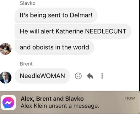 This lead me to oboist and advocate Katherine Needleman. I am not an oboe player or professional, and I don't have connections like she does in the oboe world. I asked if she knew the students mentioned in Alex's email or their whereabouts. I also showed her the messages Alex wrote about her, including calling her a “Queen of Filth”. I felt she had every right to know about the defamatory remarks he was making about her.